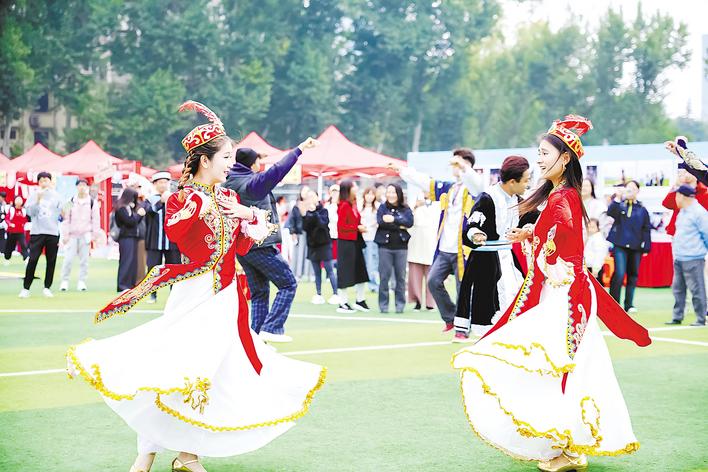 10月25日,華中科技大學“同心筑夢新征程,同行共繪華夏情”第十二屆“石榴紅”文化節(jié)火熱開展,身著民族服飾的學生們載歌載舞。(湖北日報全媒記者 何宇欣 通訊員 穆尼熱 實習生 何抒澄 攝)