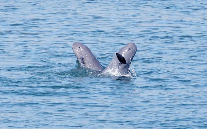長江葛洲壩下游大江水域,江豚在逐浪嬉戲。 (劉曙松 攝)